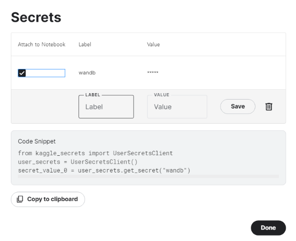 Label에 wandb 쓰고, Value에 복사한 API keys 붙여넣고 Save를 누른다.