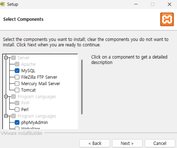 ▷ Select Components: 필요한 Apache, MySQL, PHP, phpMyAdmin만 선택했음