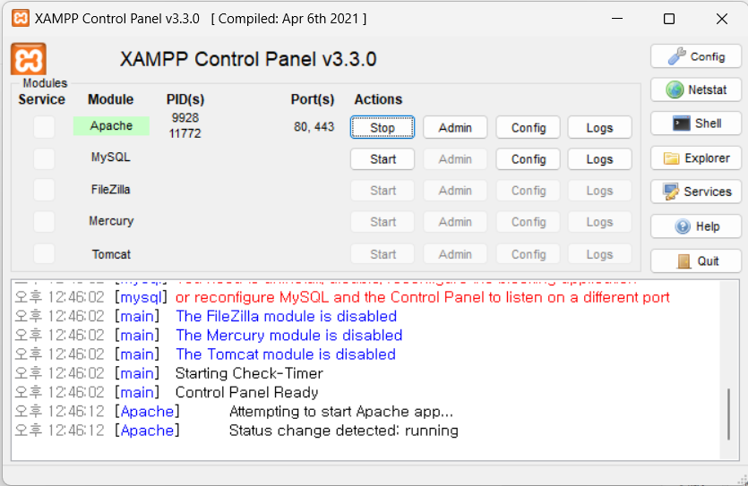 ▷ Control Panel: 예제 프로그램을 실행했을 때 '페이지를 연결할 수 없음' 메세지가 뜬다면, XAMPP 컨트롤 패널을 열어 Apache 프로그램을 구동하면 됨